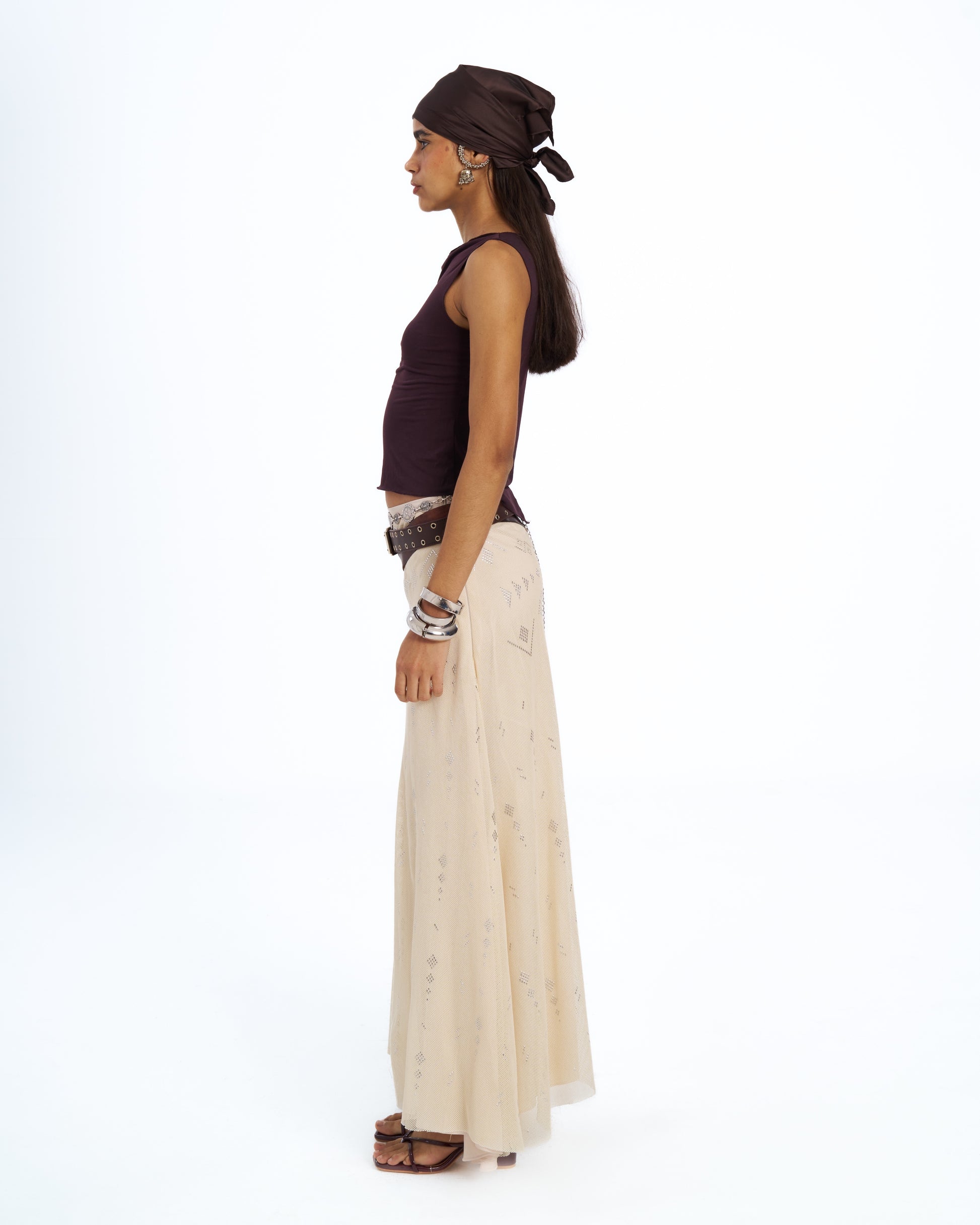 The ASSIA Skirt reimagines the traditional Egyptian craft of tally embroidery through a contemporary lens. The metallic threadwork forms modern tribal patterns that replace yet still honor the original motifs, paying tribute to the women who preserved this art form across generations.