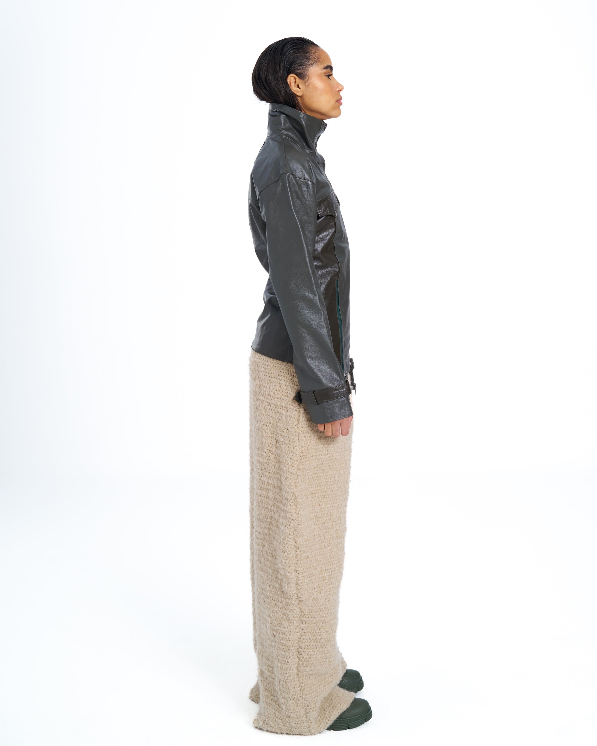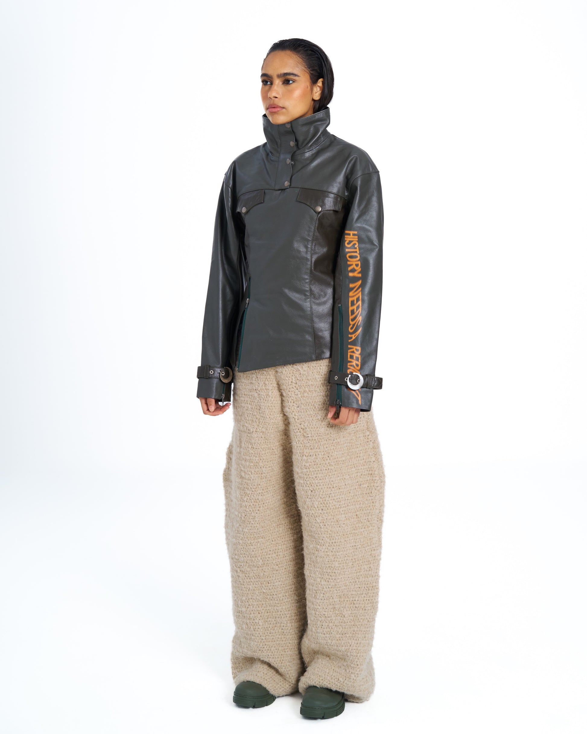 The Ceza Anorak challenges the conventions of utility wear through refinement and purpose. Crafted from genuine leather skins hand dyed with natural pigments in two tones of green, it merges military precision with artisanal irregularity. The structure is anchored by a high fastening collar, reinforced sleeves, and adjustable wrist straps, while a screen printed statement on the arm reads History Needs a Reright, a declaration of reclamation and authorship.