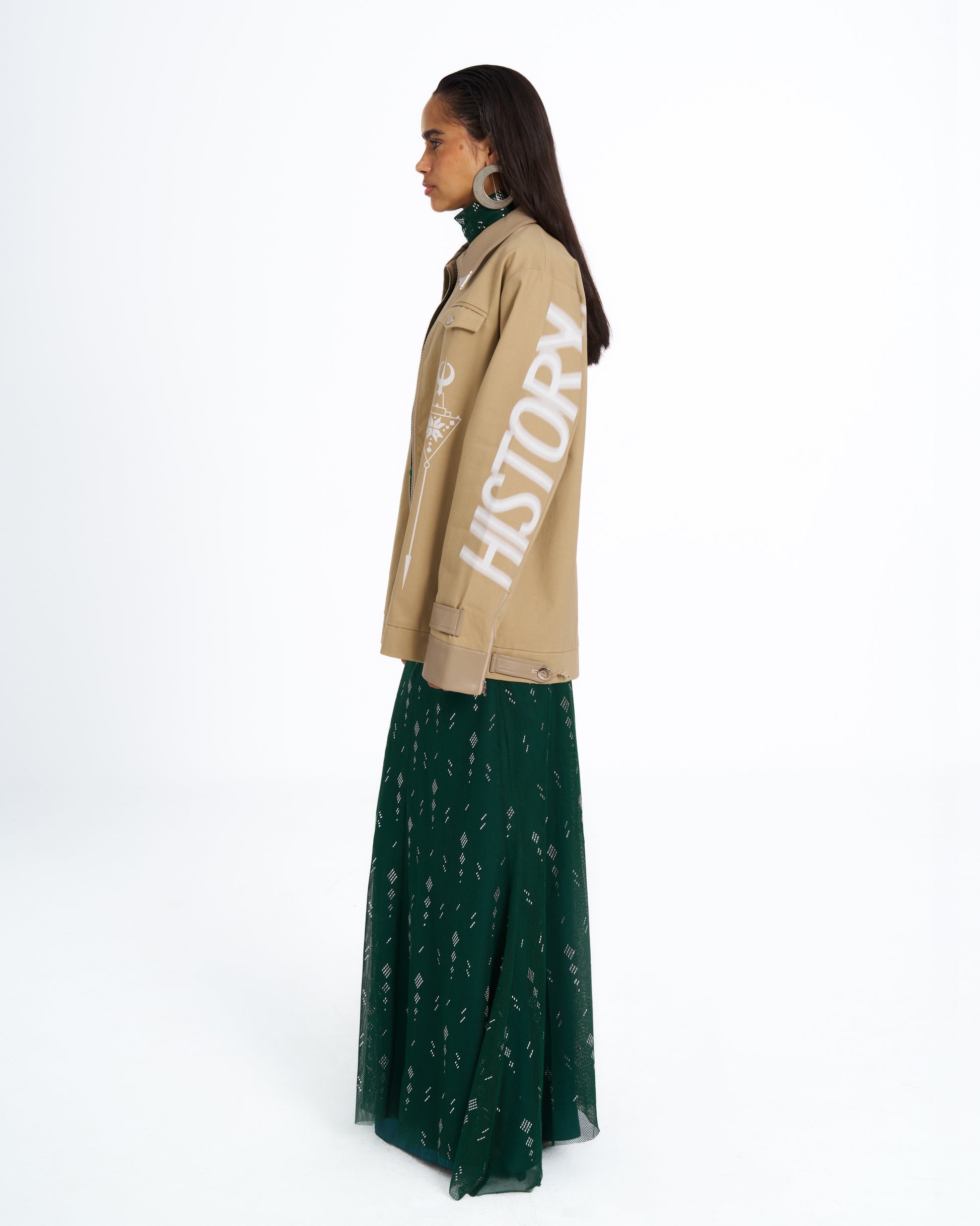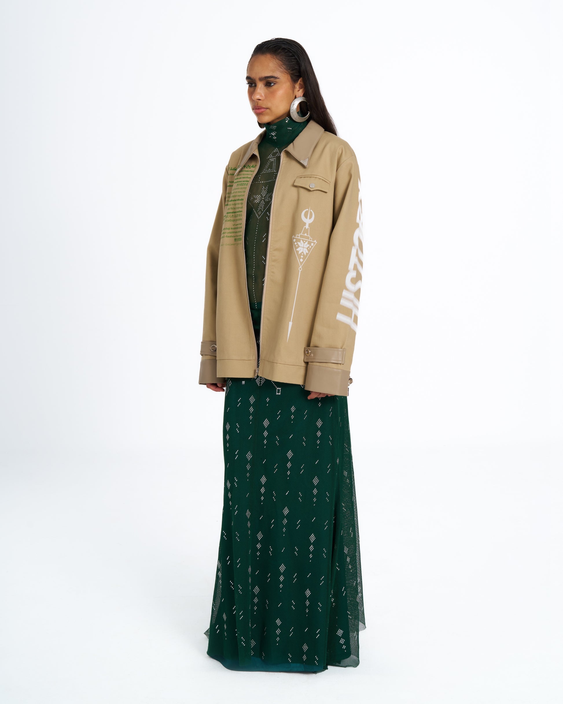 The text and tribal motifs across the body act as coded archives, stories once silenced now reimagined in bold visual form. Metal collar tips engraved with traditional Egyptian patterns add a tactile depth, fusing the rawness of streetwear with the refinement of heritage craftsmanship.