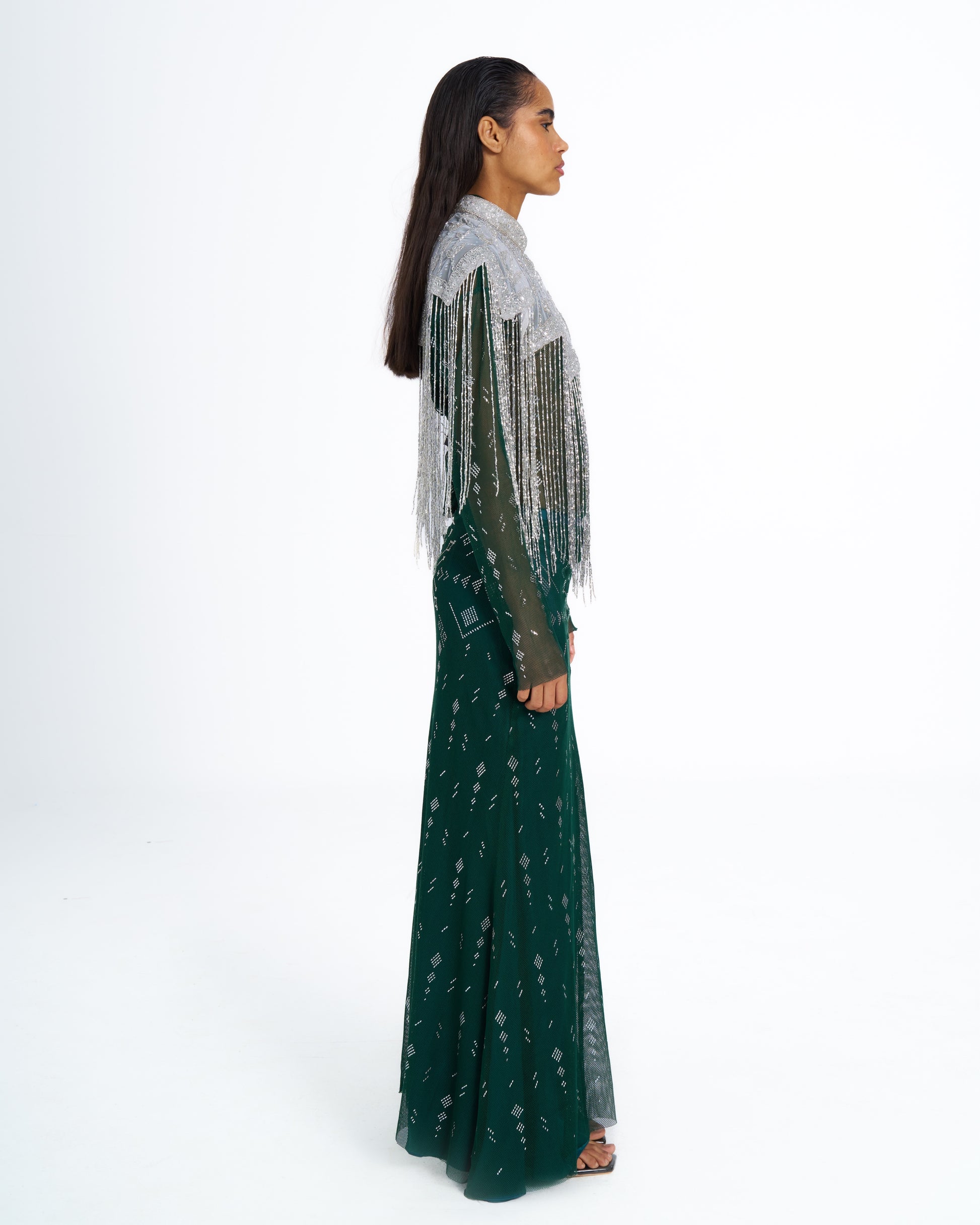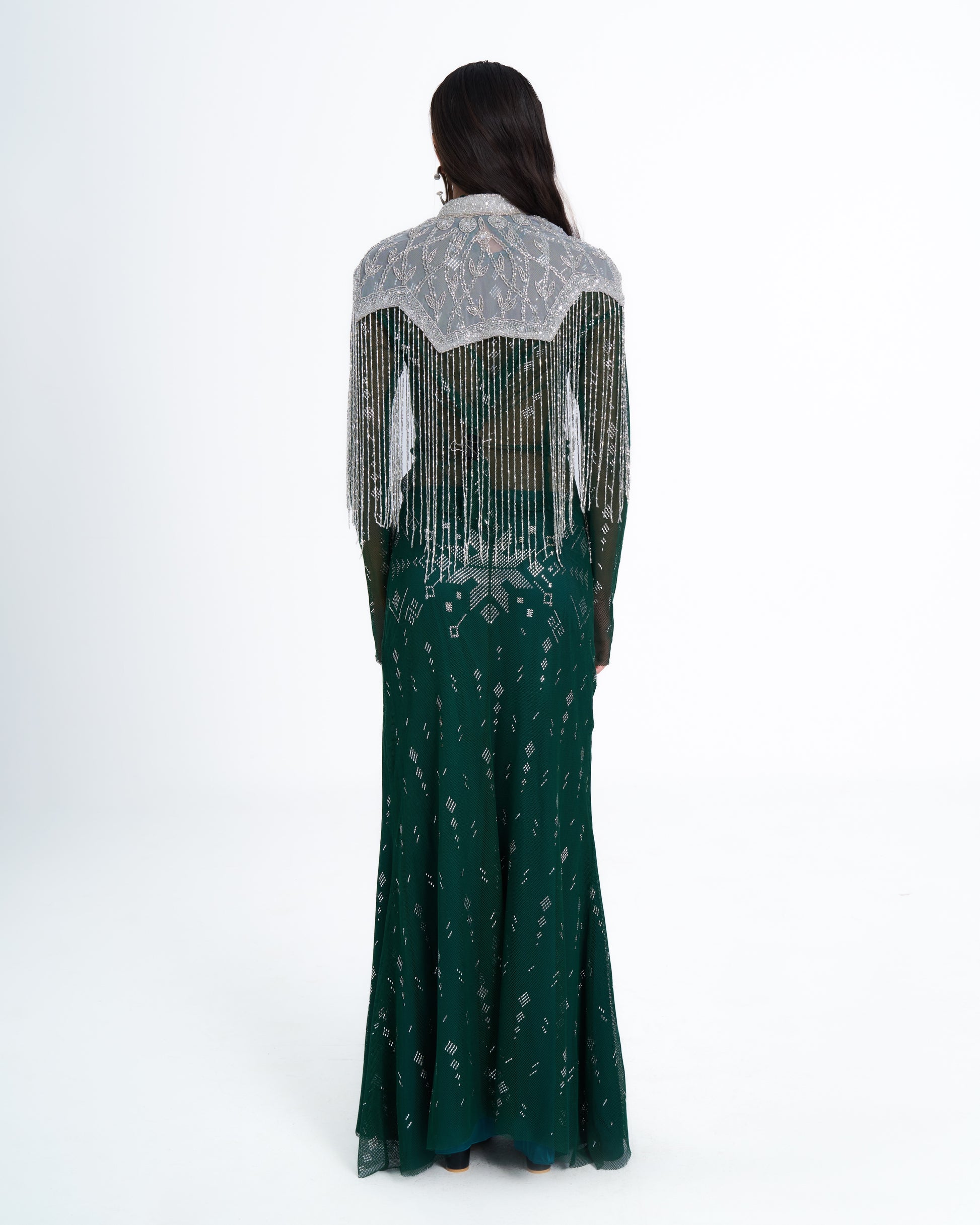 The Nazira Beaded Poncho reimagines the traditional Egyptian overcoat once draped over village dresses, transforming it into a delicate, hand-beaded masterpiece. Each bead is carefully placed to create a rhythm of light and movement that honors the precision and intimacy of local craftsmanship.
