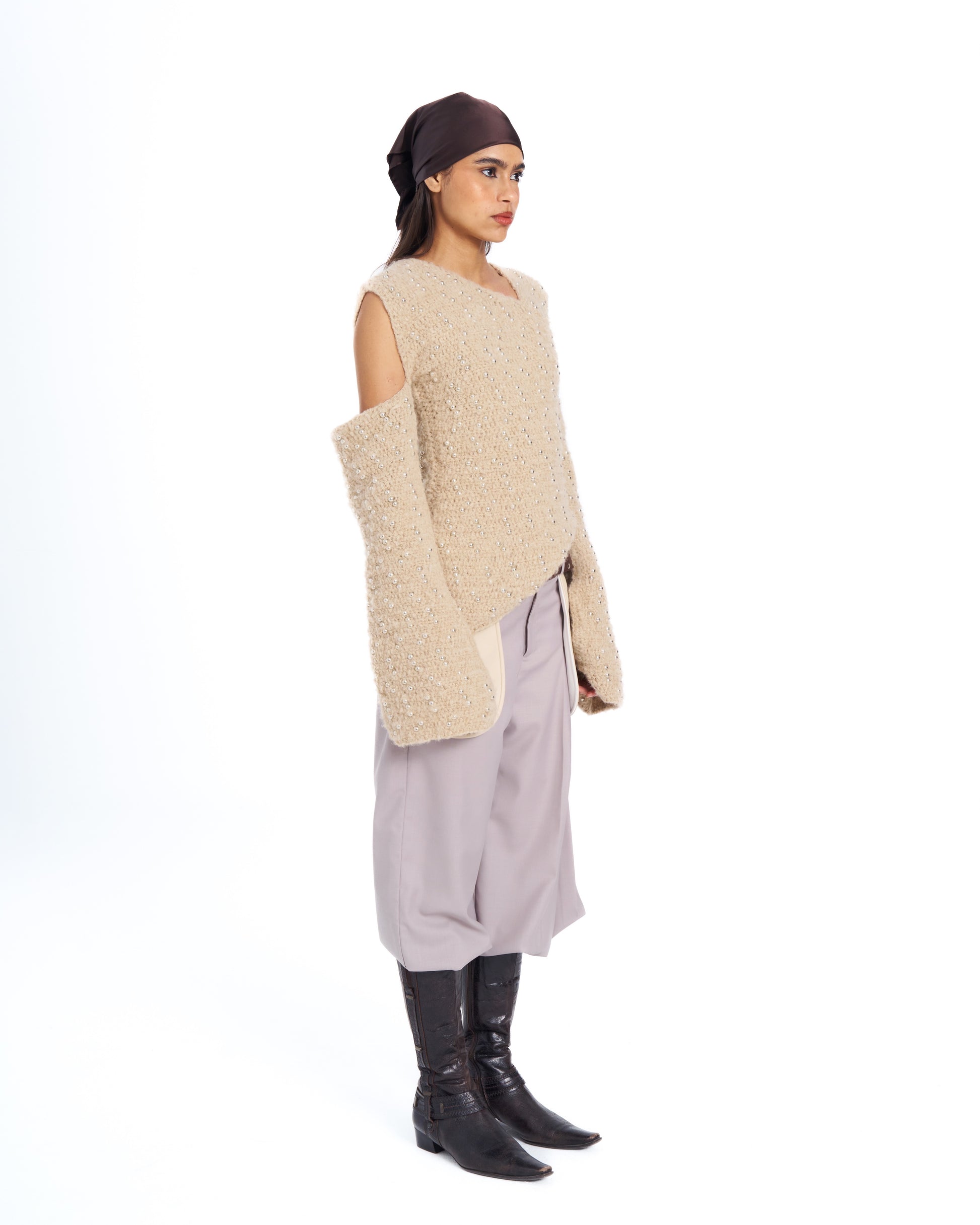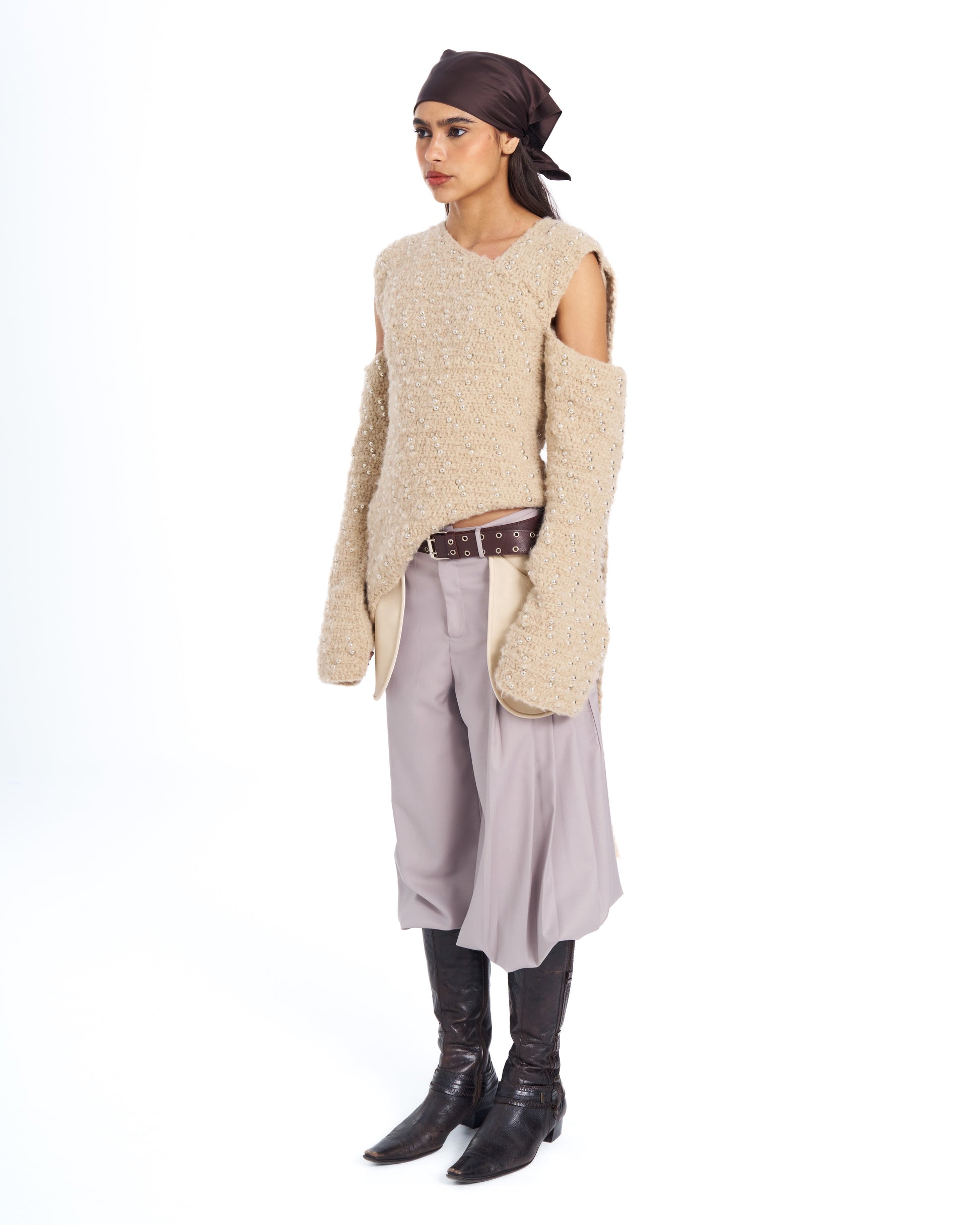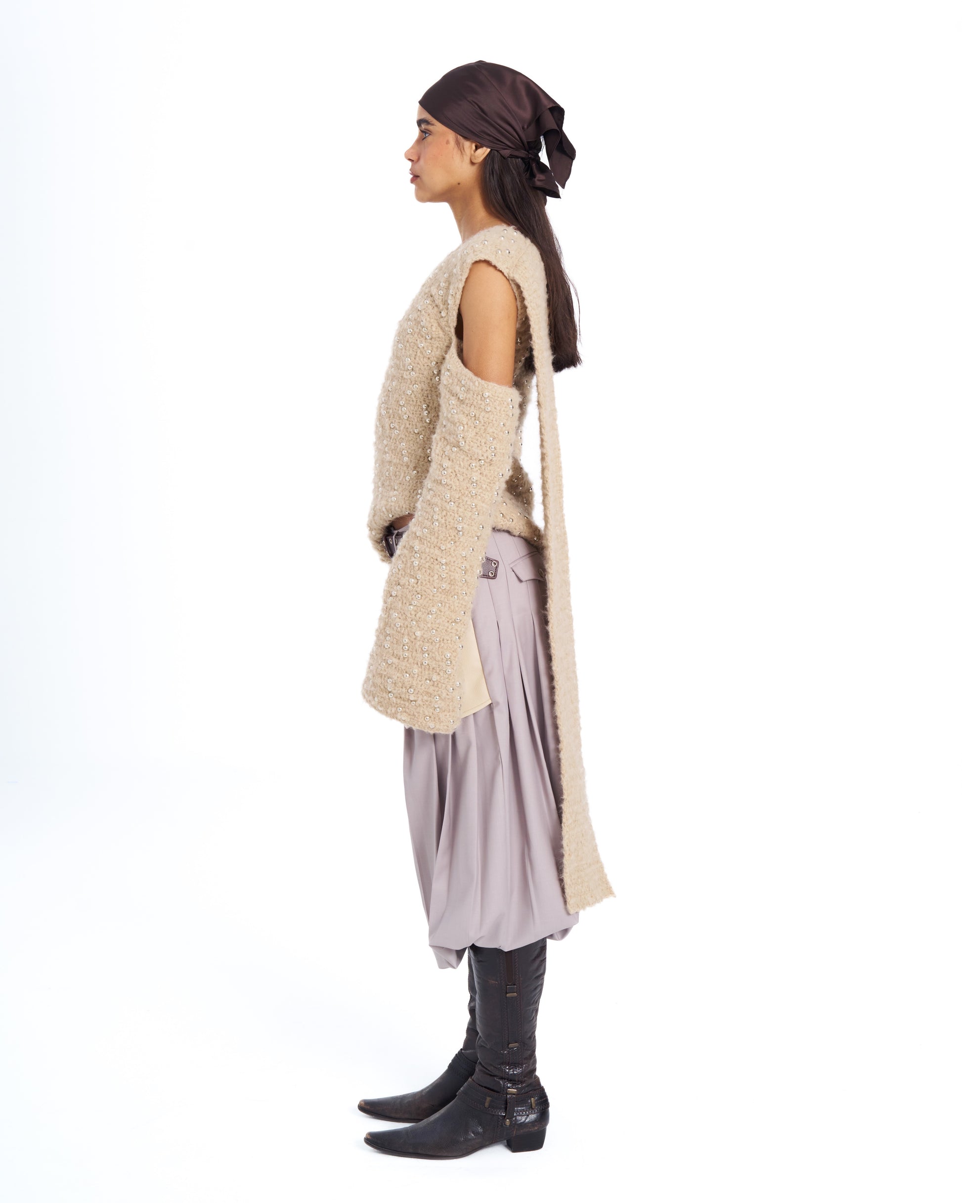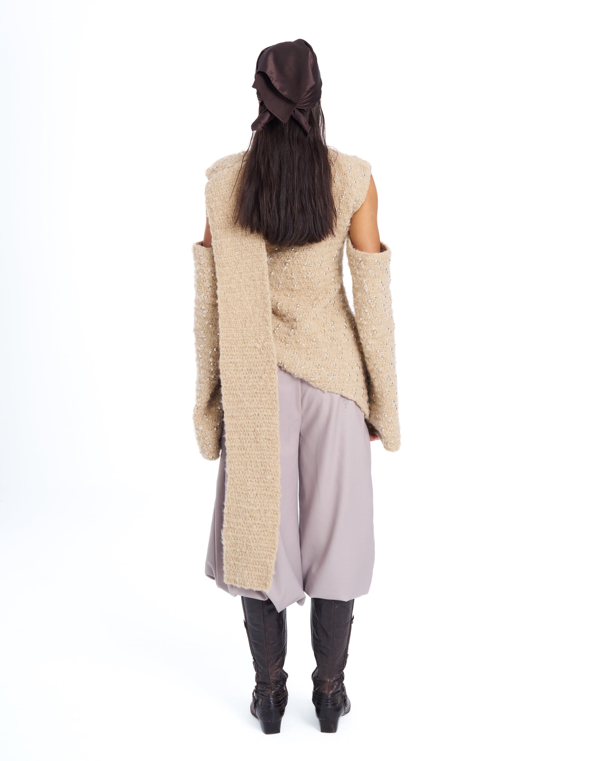 The ROSE Top is a study in softness and strength. Handcrafted using a newly developed crochet technique that bridges traditional hand crochet with intricate beading, each stitch carries both texture and light. The piece features an attached scarf that drapes elegantly from the shoulder to the back, creating movement and a quiet sense of grace.