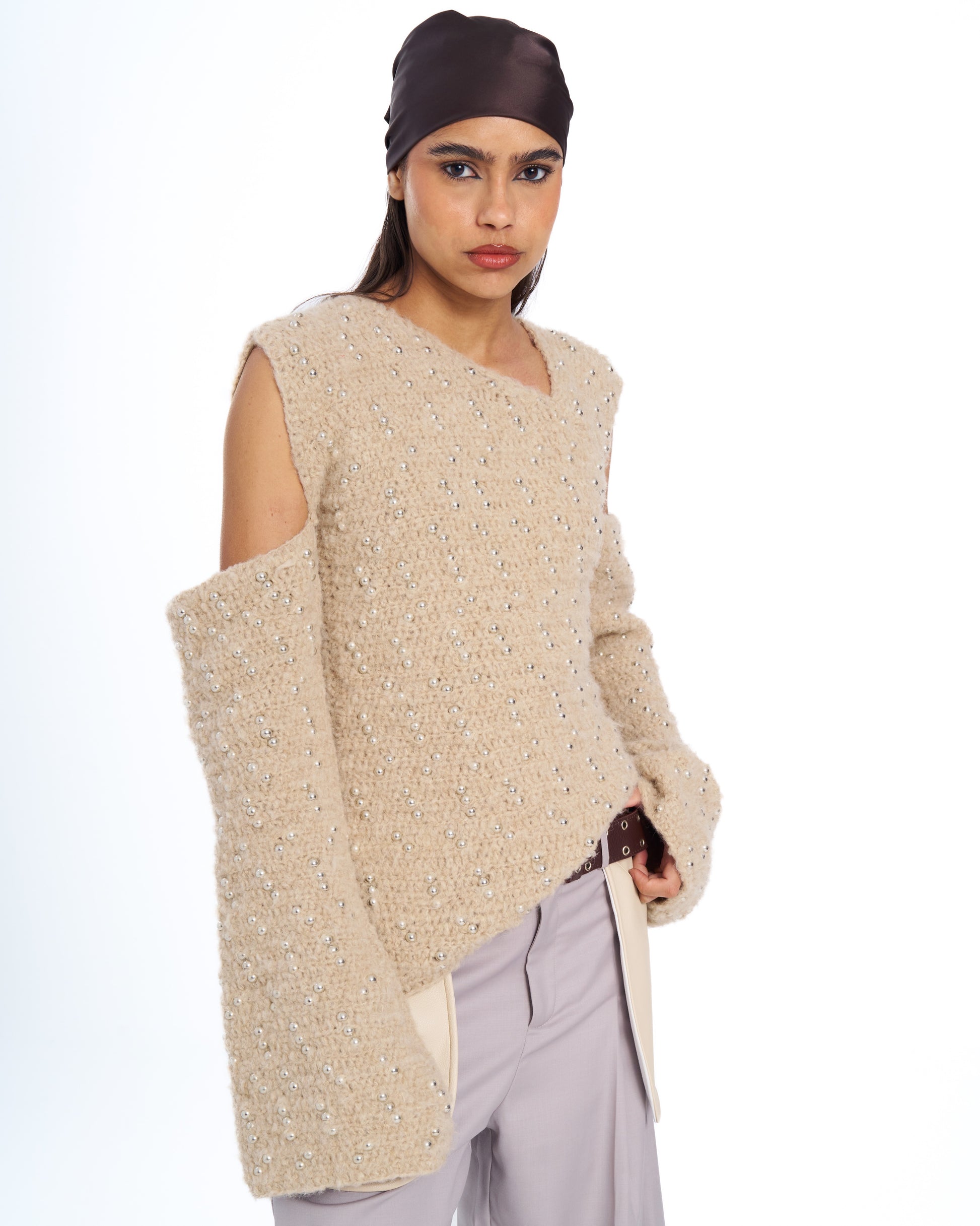 Made entirely by hand, its surface is embroidered with luminous beads that catch light like dew on woven thread, merging the intimacy of craft with the sophistication of couture.